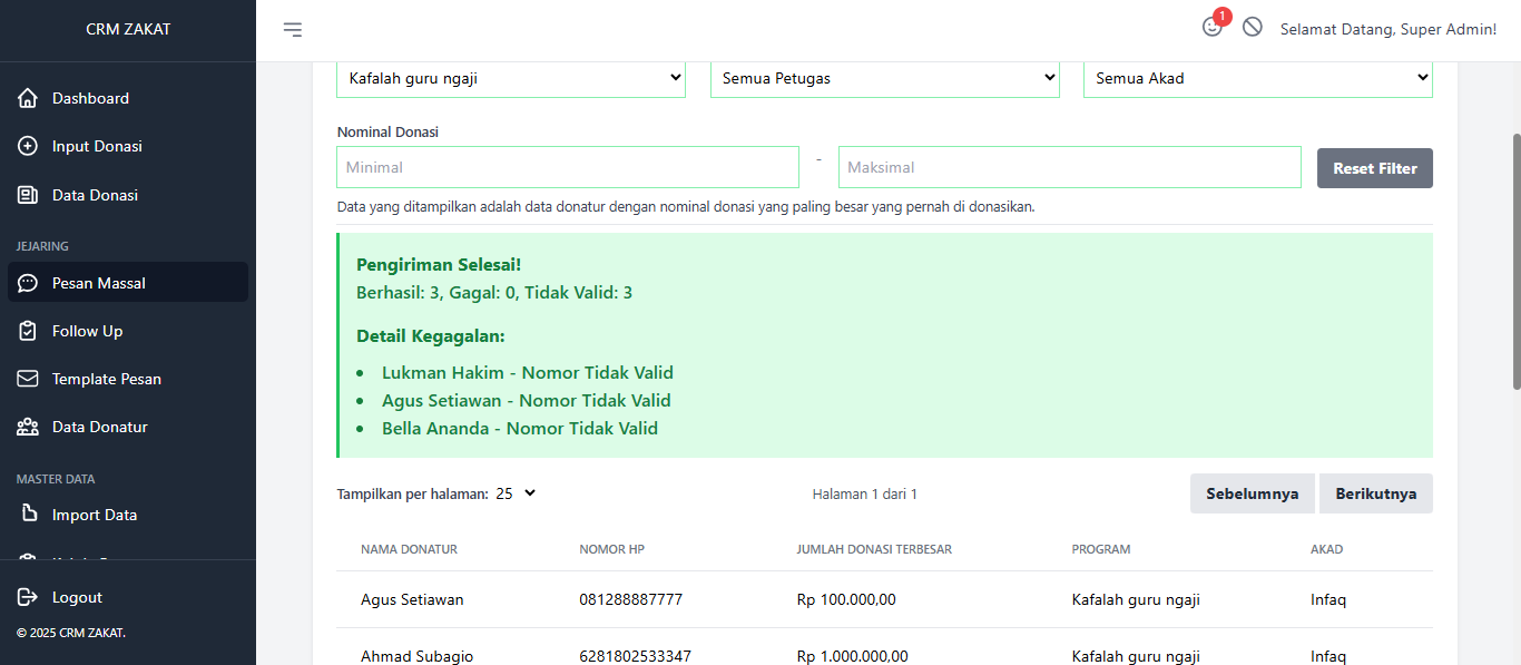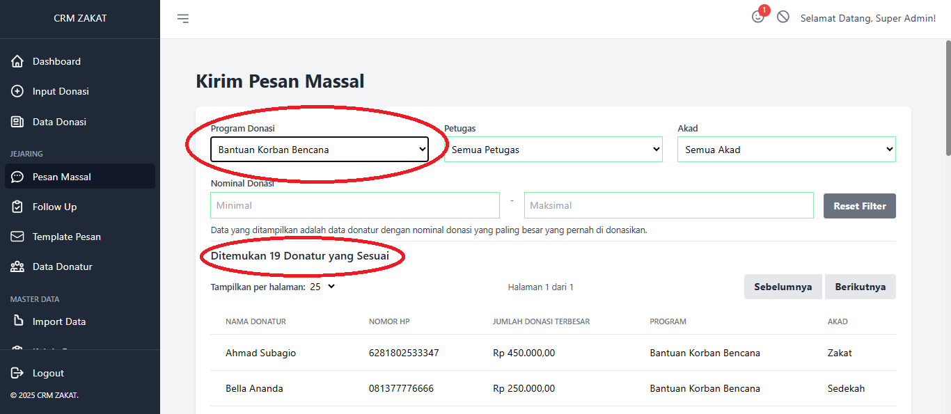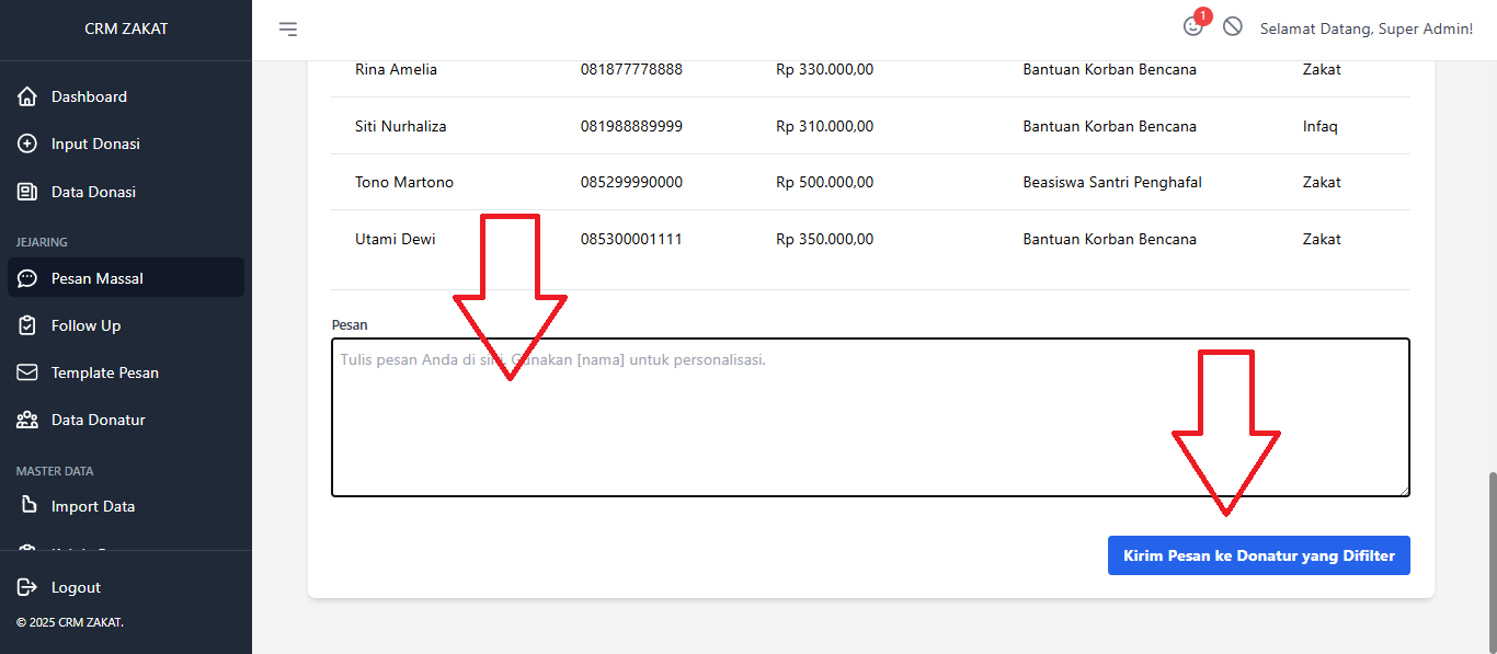 Pesan masal biasa di gunakan oleh lembaga dalam memberikan informasi kepada donatur. Di sini di lengkapi filter donatur, kita bisa menyesuaikan pengiriman pesan ke donatur tertentu. misal khusus program A, maka pesan tersebut akan ter kirim ke donatur yang terlah berdonasi di program A.